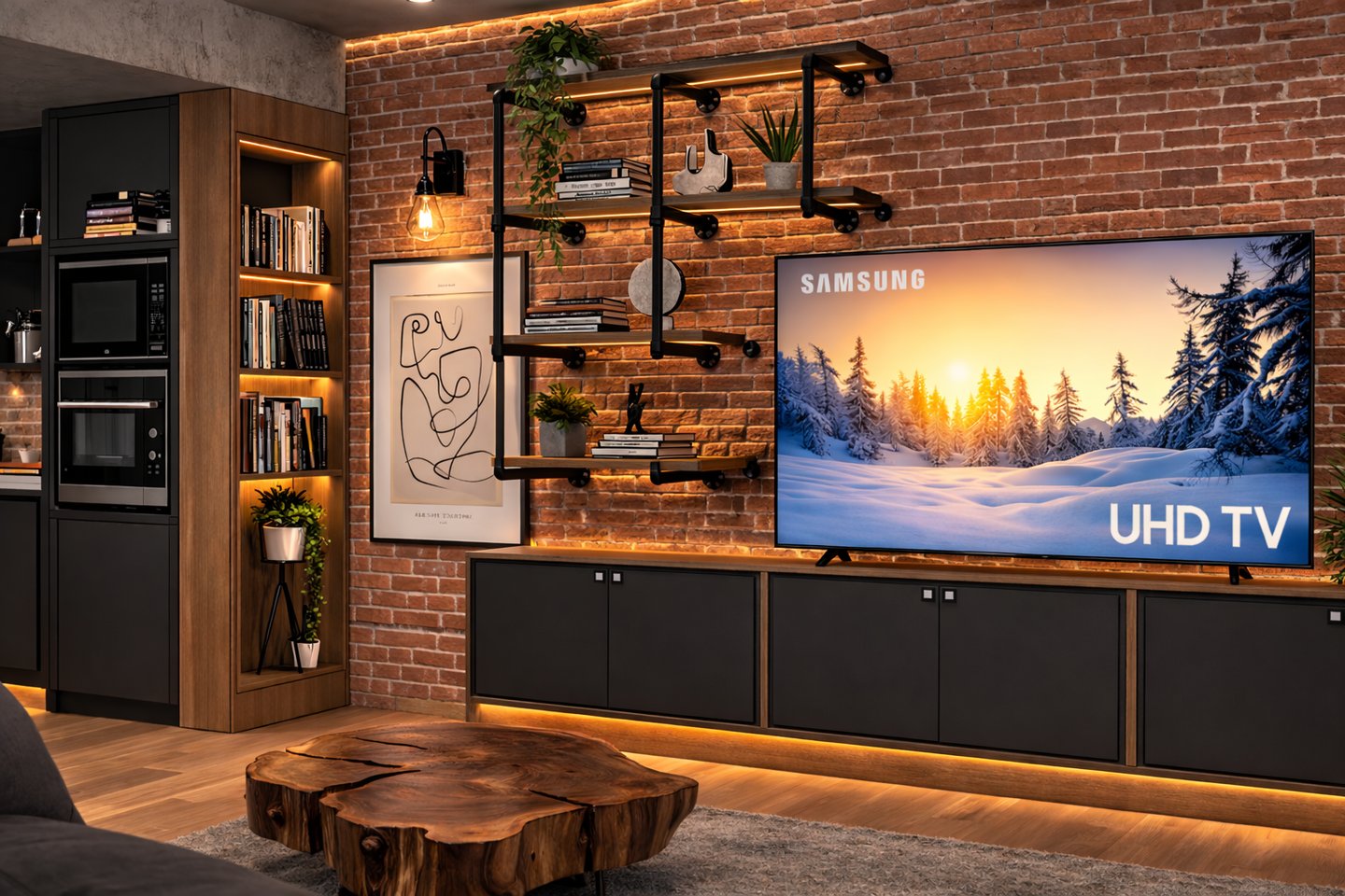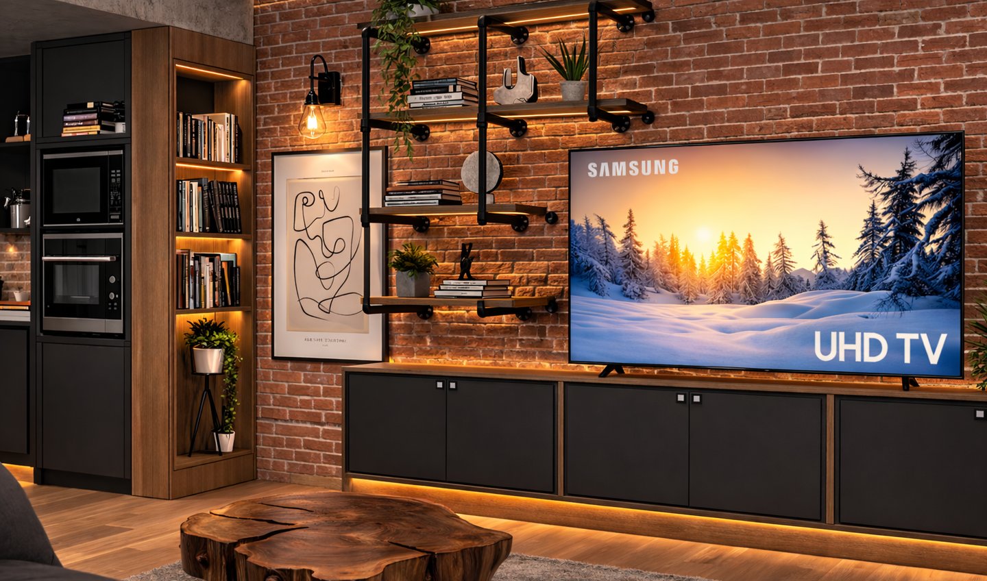 A contemporary interior combining raw textures with warm lighting and refined composition.