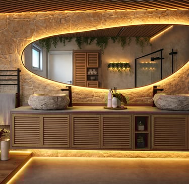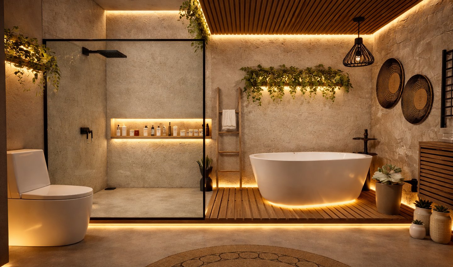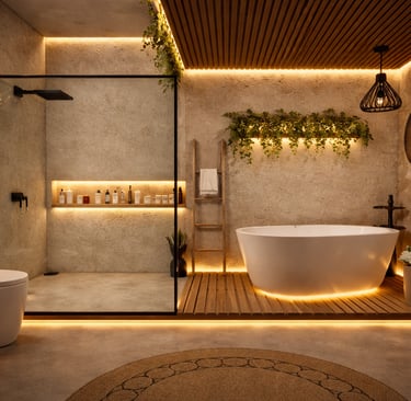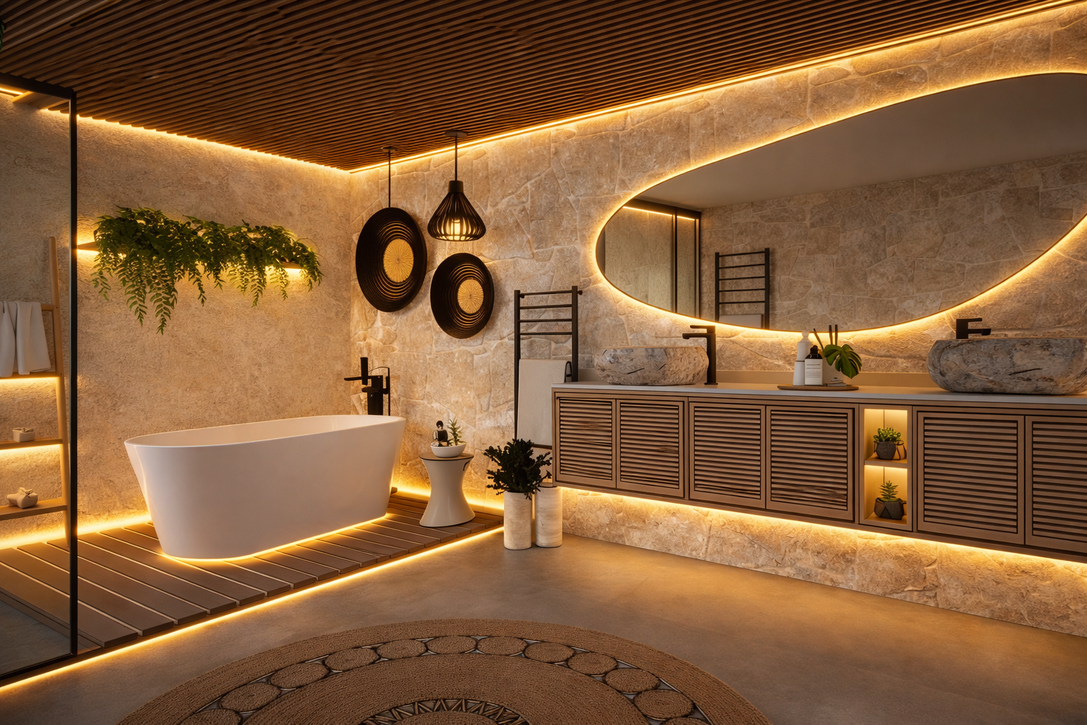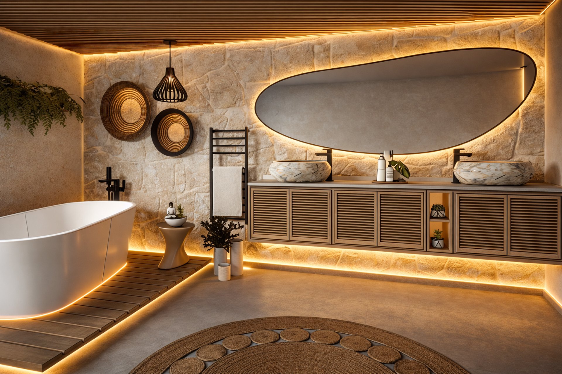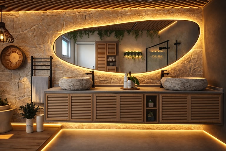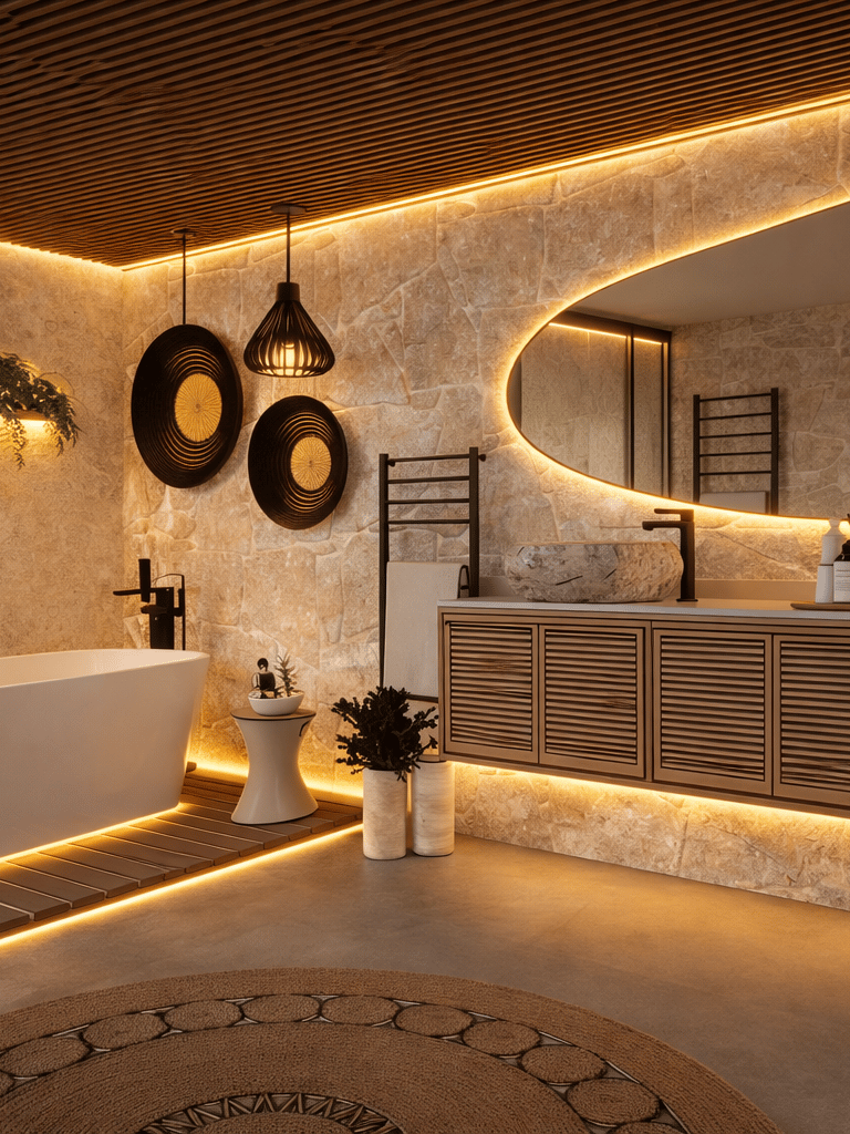 A serene bathroom combining natural textures and soft lighting to create a spa-like experience.